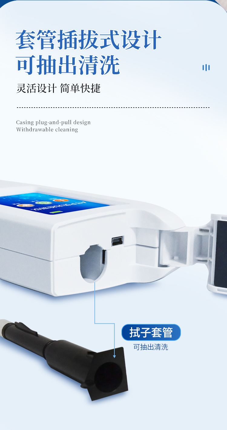 該設(shè)備采用生物化學(xué)反應(yīng)方法檢測(cè)ATP含量,ATP熒光檢測(cè)儀基于螢火蟲發(fā)光原理,利用“熒光素酶—熒光素體系”快速檢測(cè)三磷酸腺苷(ATP)。ATP拭子含有可以裂解細(xì)胞膜的試劑,能將細(xì)胞內(nèi)ATP釋放出來(lái),與試劑中含有的特異性酶發(fā)生反應(yīng),產(chǎn)生光,再用熒光照度計(jì)檢測(cè)發(fā)光值,微生物的數(shù)量與發(fā)光值成正比,由于所有生物活細(xì)胞中含有恒量的ATP,所以ATP含量可以清晰地表明樣品中微生物與其他生物殘余的多少,用于判斷衛(wèi)生狀況。