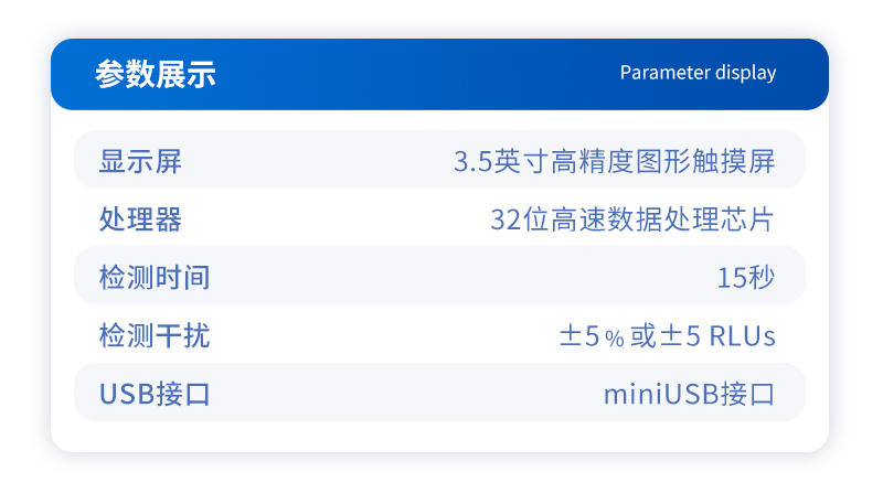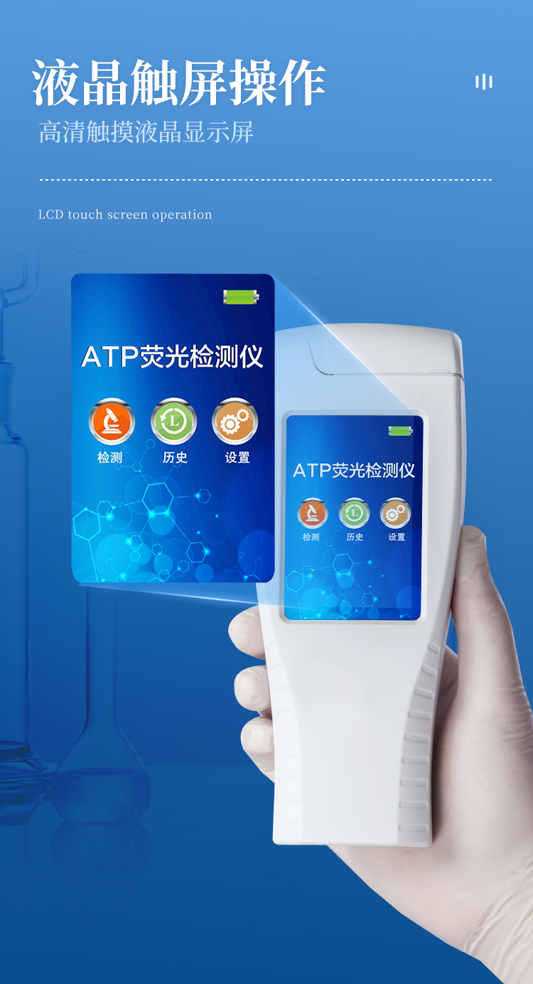 該設(shè)備采用生物化學反應(yīng)方法檢測ATP含量,潔凈度檢測儀基于螢火蟲發(fā)光原理,利用“熒光素酶—熒光素體系”快速檢測三磷酸腺苷(ATP)。ATP拭子含有可以裂解細胞膜的試劑,能將細胞內(nèi)ATP釋放出來,與試劑中含有的特異性酶發(fā)生反應(yīng),產(chǎn)生光,再用熒光照度計檢測發(fā)光值,微生物的數(shù)量與發(fā)光值成正比,由于所有生物活細胞中含有恒量的ATP,所以ATP含量可以清晰地表明樣品中微生物與其他生物殘余的多少,用于判斷衛(wèi)生狀況。