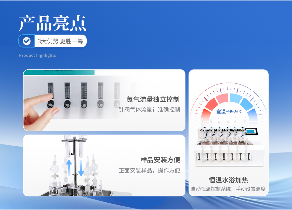 1、大容量反應(yīng)瓶,可同時處理多個樣品。 2、鹽酸口、氣體進口、出口三口一體且相互獨立,操作會不干擾。 3、恒溫水浴加熱,具有快速自動恒溫控制系統(tǒng),加熱溫度可以手動設(shè)定。 4、由升降位置固定旋鈕調(diào)節(jié)樣品架及配氣系統(tǒng)的升降旋轉(zhuǎn)樣品架,正面安裝樣品,操作方便。 5、每個樣品的氮氣流量獨立控制調(diào)節(jié)或關(guān)閉,針閥氣體流量計準確控制和顯示氣體總消耗量。