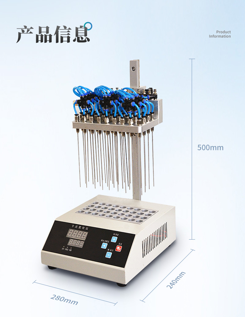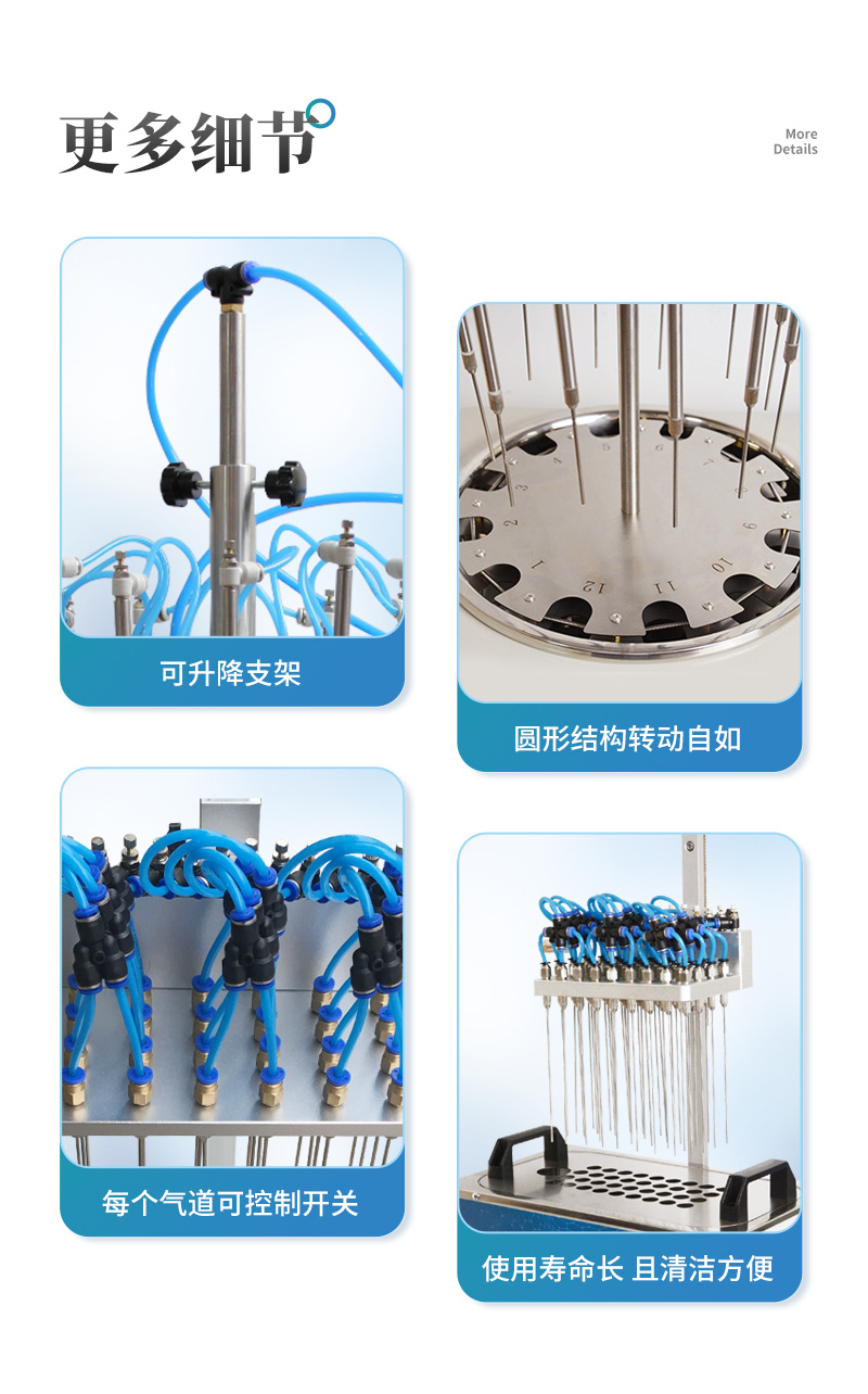 7.圓形氮吹儀的所有部件均勻不銹鋼制造,可耐酸堿等有機(jī)溶劑。