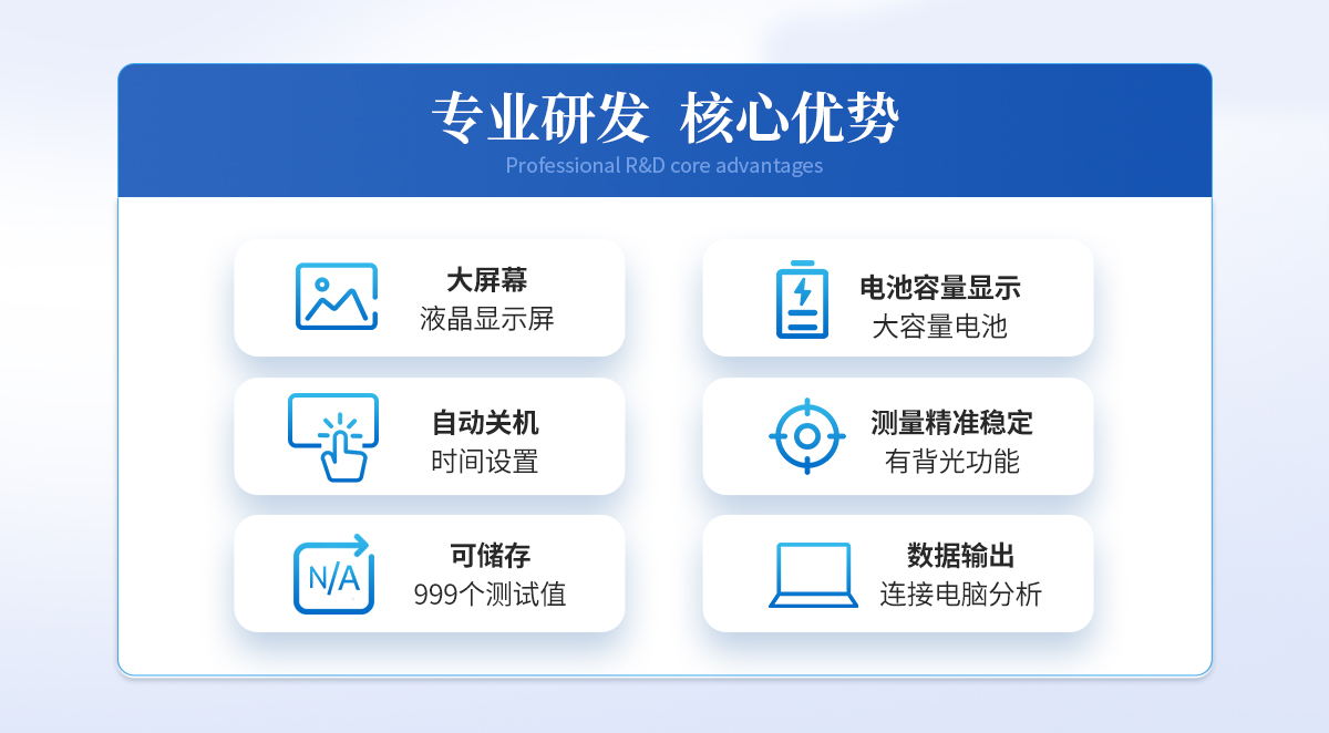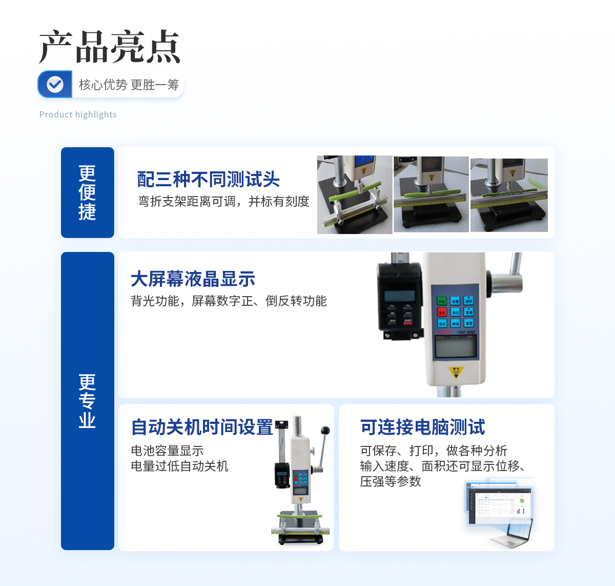 | 1、三種不同測頭:可進(jìn)行莖桿彎折性能測量、莖稈抗壓強度測量、莖桿組織結(jié)構(gòu)(穿刺)強度測量;彎折支架距離可調(diào),并標(biāo)有刻度。 | 2、可配測位移標(biāo)尺 | 3、可連接電腦測試,可保存、打印,做各種分析,輸入速度、面積還可顯示位移、壓強等參數(shù); | 4、可儲存999個測試值; | 5、大屏幕液晶顯示,有背光功能,并具有屏幕數(shù)字正、倒反轉(zhuǎn)功能; | 6、自動關(guān)機時間設(shè)置; | 7、電池容量顯示,電量過低自動關(guān)機。 |
