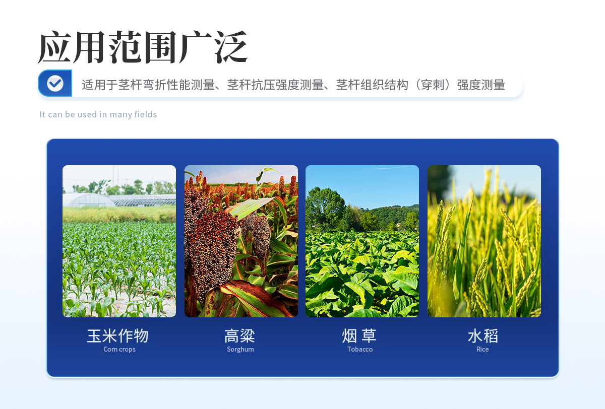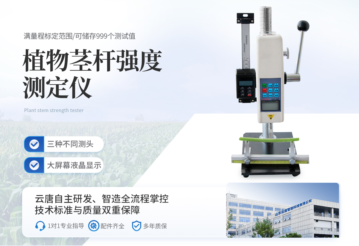 植物莖稈的強度是決定作物抗倒伏能力的一個主要因素,長期以來玉米,高梁、煙草等的倒伏給作物的機械收割造成很大的困難。從機械化水平來說,造成大量的糧食浪費。另外,作物倒伏導(dǎo)致光照不充分,使其生產(chǎn)量受到極大的限制。在作物生長的各個階段對其莖稈進(jìn)行活體測量,進(jìn)而根據(jù)莖桿纖維層的抗彎阻力與抗倒伏能力的相關(guān)性對群體測量數(shù)據(jù)進(jìn)行統(tǒng)計處理,對作物的栽培和育種具有重要意義。植物莖稈強度儀采用拉壓力傳感器,通過針刺、壓碎、折斷的方式測出莖稈斷裂或者屈服瞬間產(chǎn)生的**力,即莖稈的強度