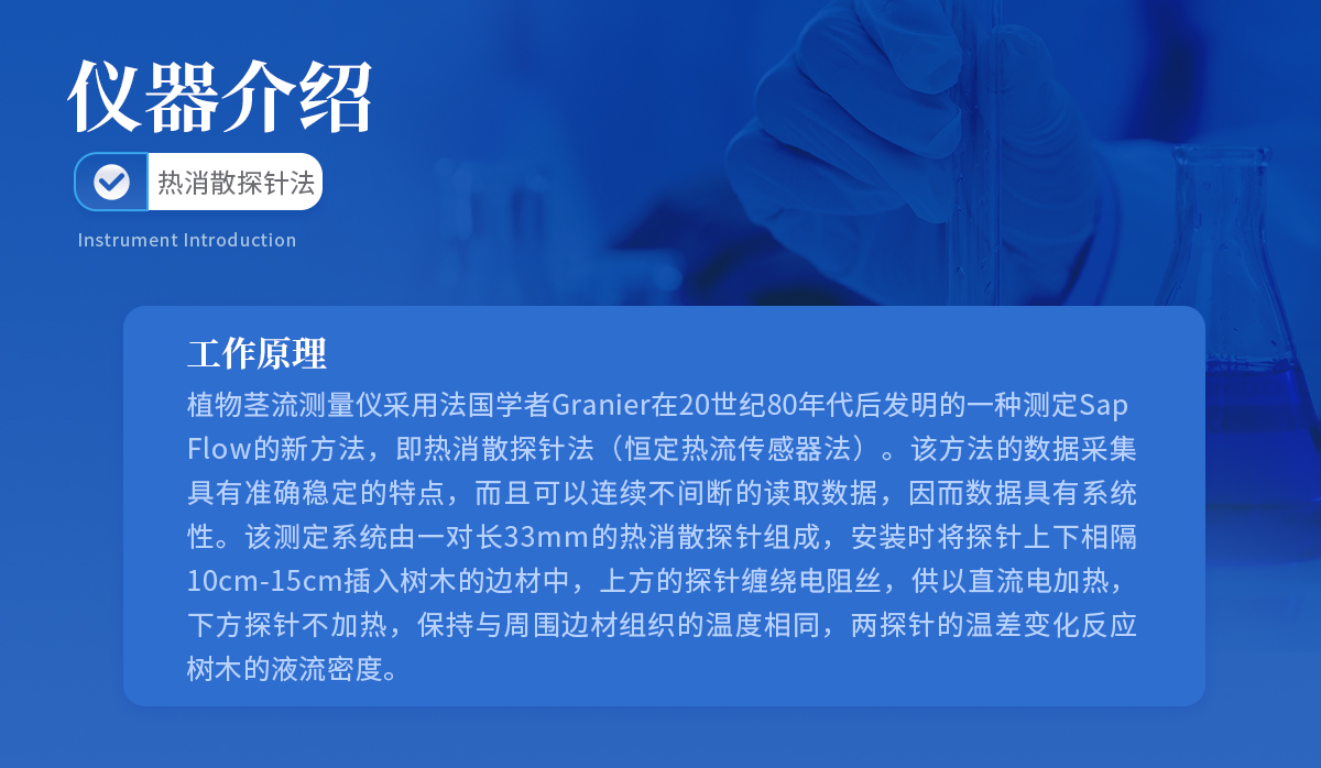 植物莖流測量儀采用法國學者Granier在20世紀80年代后發(fā)明的一種測定Sap Flow的新方法,即熱消散探針法(恒定熱流傳感器法)。該方法的數(shù)據采集具有準確穩(wěn)定的特點,而且可以連續(xù)不間斷的讀取數(shù)據,因而數(shù)據具有系統(tǒng)性。該測定系統(tǒng)由一對長33mm的熱消散探針組成,安裝時將探針上下相隔10cm-15cm插入樹木的邊材中,上方的探針纏繞電阻絲,供以直流電加熱,下方探針不加熱,保持與周圍邊材組織的溫度相同,兩探針的溫差變化反應樹木的液流密度。