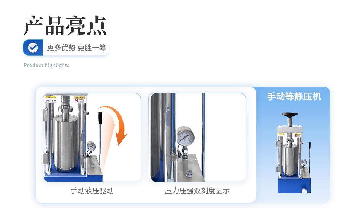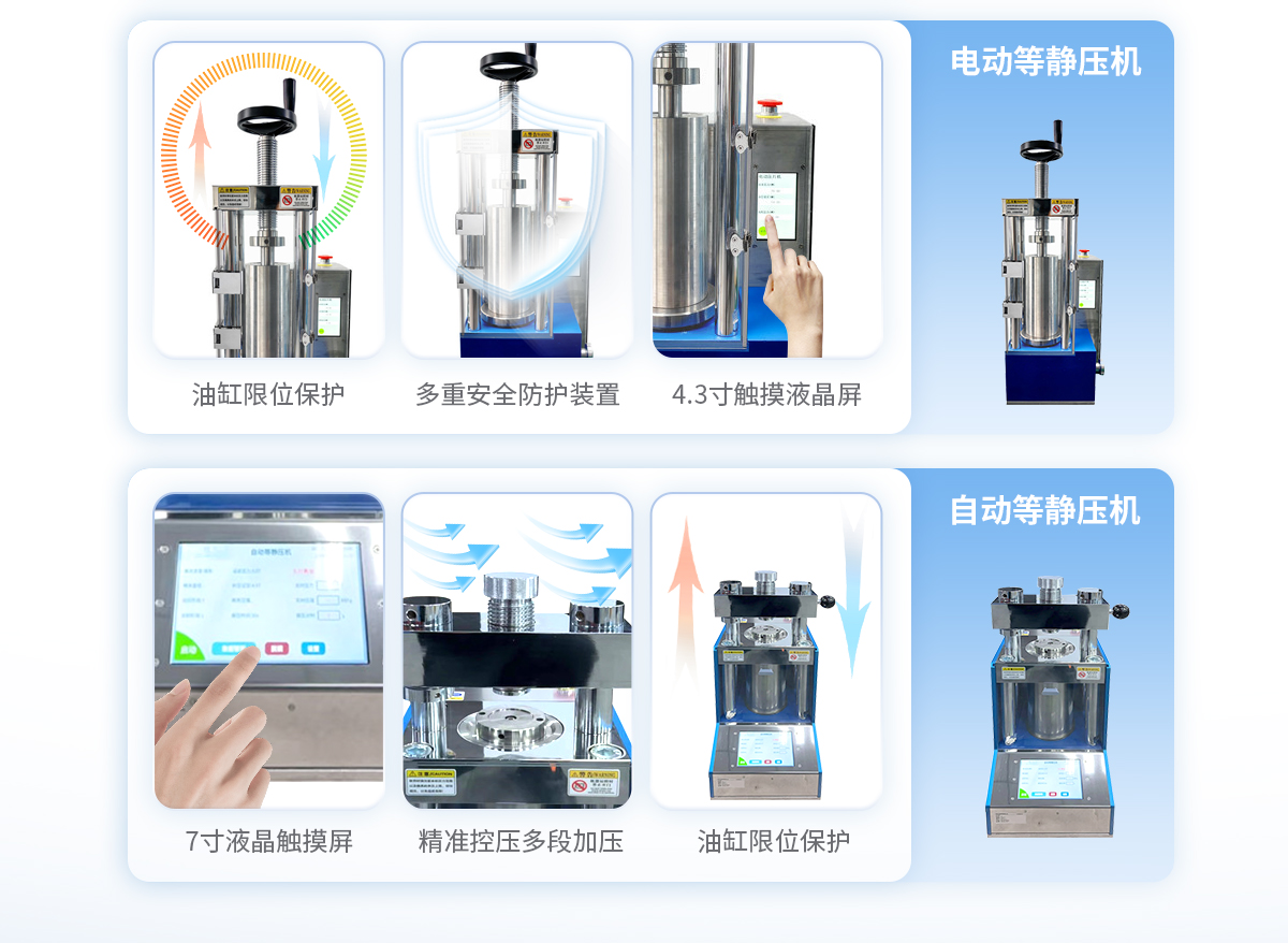 該機采用電動液壓驅(qū)動,分體式結(jié)構(gòu),智能化的程序控制系統(tǒng),安全可靠的防護裝置,制樣完畢可輕松拖動等靜壓腔體至取樣平臺,其操作簡便,取樣方便,適合需要大噸位、大物件樣品的等靜壓實驗。