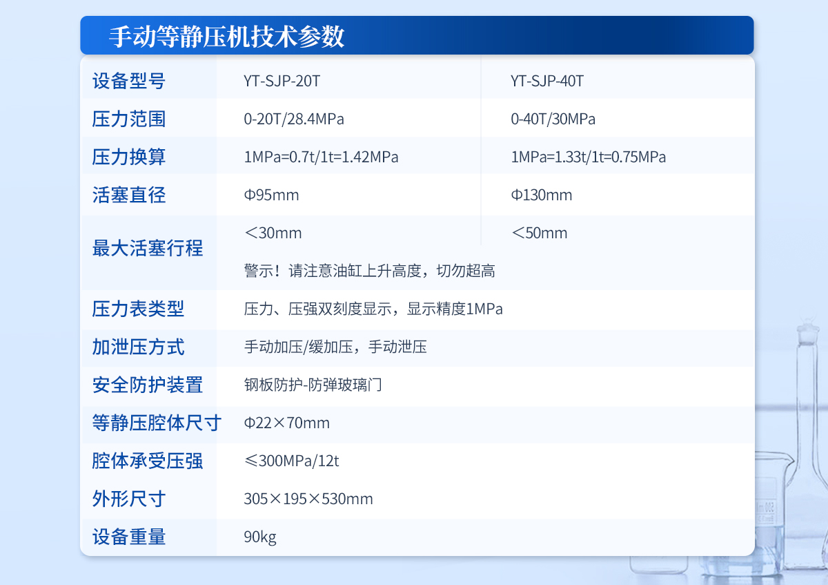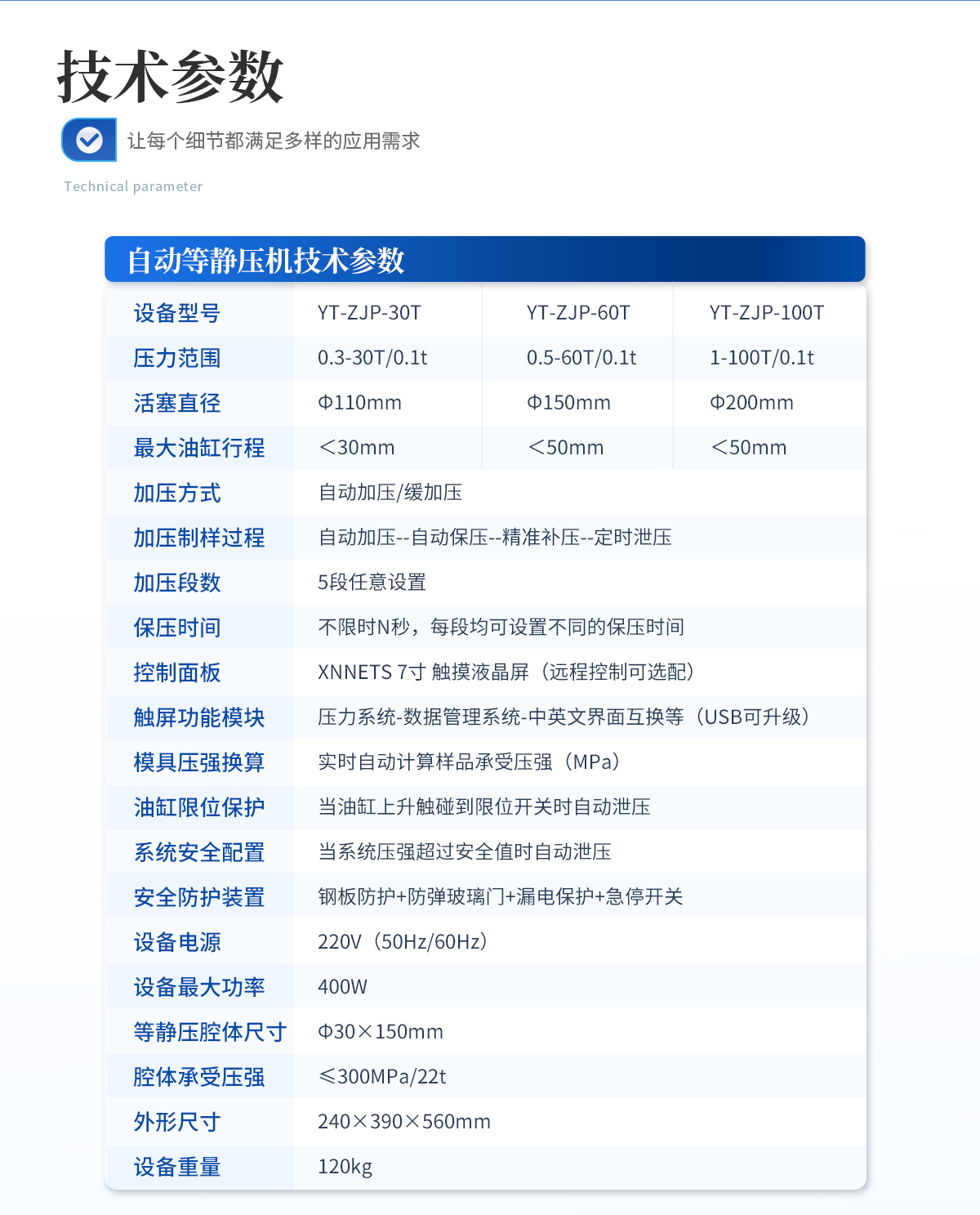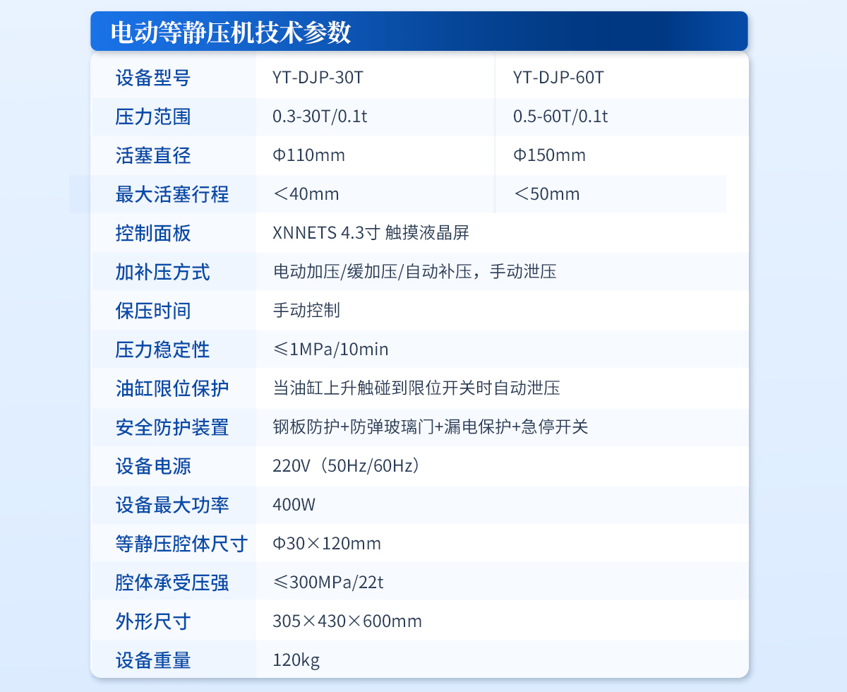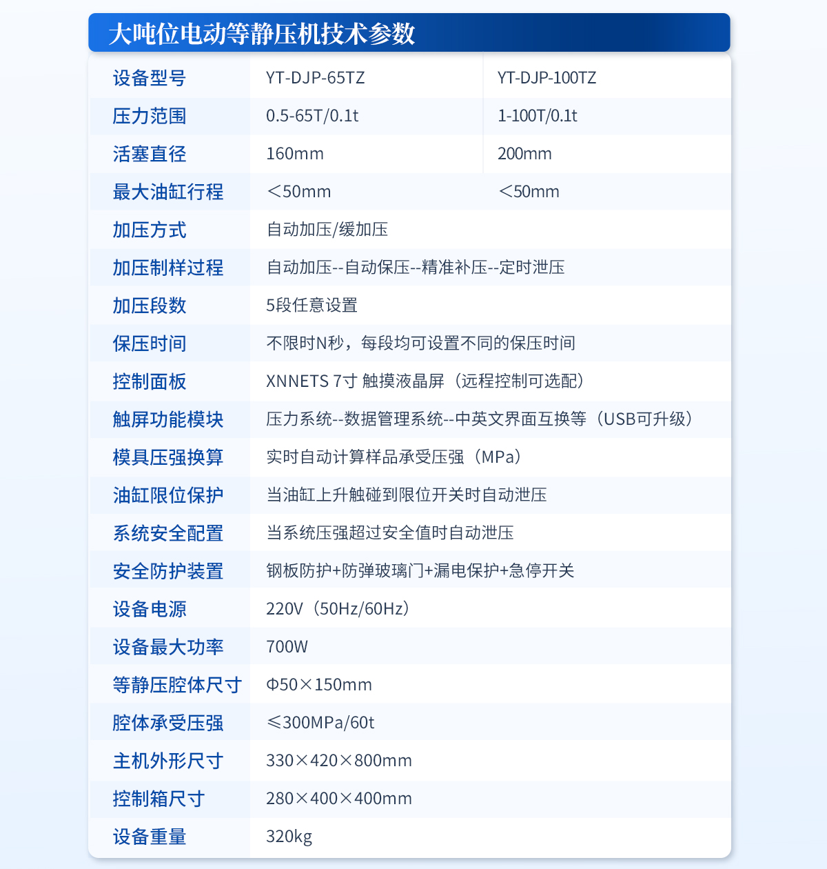 | 規(guī)格型號:YT-DJP-100TZ | 壓力范圍:1-100T/0.1t | 活塞直徑 :200mm | **油缸行程:<50mm | 加壓方式:自動加壓/緩加壓 | 加壓制樣過程:自動加壓--自動保壓--精準補壓--定時泄壓 | 加壓段數(shù):5段任意設置 | 保壓時間 :不限時N秒,每段均可設置不同的保壓時間 | 控制面板:XNNETS 7寸 觸摸液晶屏(遠程控制可選配) | 觸屏功能模塊:壓力系統(tǒng)-數(shù)據(jù)管理系統(tǒng)--中英文界面互換等(USB可升級) | 模具壓強換算:實時自動計算樣品承受壓強(MPa) | 油缸限位保護:當油缸上升觸碰到限位開關時自動泄壓 | 系統(tǒng)安全配置:當系統(tǒng)壓強超過安全值時自動泄壓 | 安全防護裝置:鋼板防護+防彈玻璃門+漏電保護+急停開關 | 設備電源:220V(50Hz/60Hz) | 設備**功率:700W | 等靜壓腔體尺寸:Φ60×150mm | 腔體承受壓強:≤300MPa/87t | 主機外形尺寸:380×520×950mm | 控制箱尺寸:350×500×480mm | 設備重量 :510kg | 配置說明:主機1臺,控制箱1臺,等靜壓腔體1套!可根據(jù)需求定制500MPa等靜壓機或橡膠模具 |