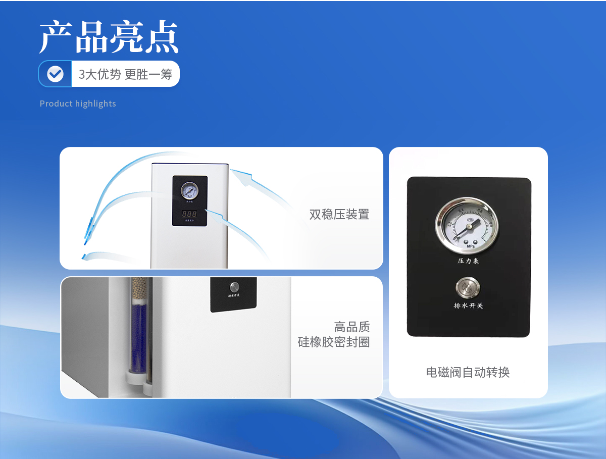 1、雙穩(wěn)壓裝置,確保高精度穩(wěn)壓條件下氣體流量的穩(wěn)定性。 2、電磁閥自動轉(zhuǎn)換,徹底杜絕了電磁閥在自動放水時產(chǎn)生的連續(xù)噪音,實(shí)現(xiàn)放水、轉(zhuǎn)換一體化。 3、儀器內(nèi)部采用硅橡膠圈,含硫量低有效提高氣體質(zhì)量,保證色譜基線穩(wěn)定。 4、體積小,雙支FV型亞克力過濾器,耐壓高,不會因工作環(huán)境及腐蝕氣體的影響,導(dǎo)致過濾管變形,開裂而產(chǎn)生漏氣現(xiàn)象,可持久使用,一勞永逸。
