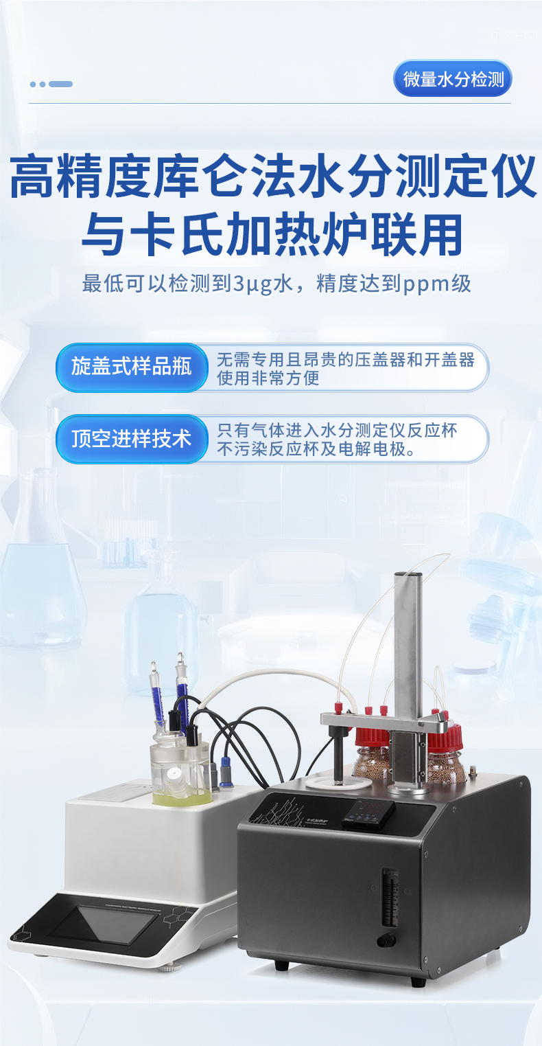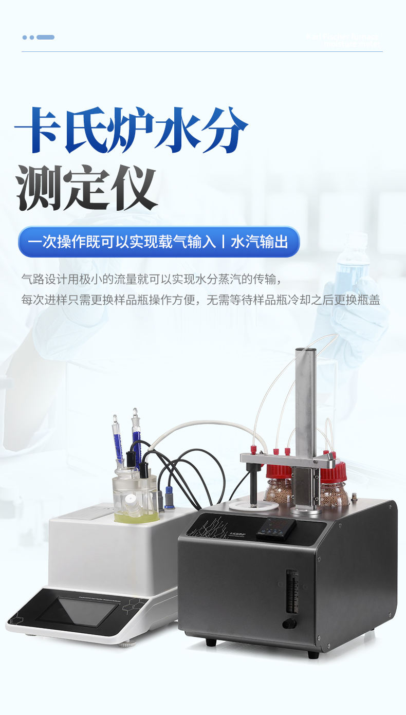 | 1. 采用高精度庫侖法水分測(cè)定儀與卡氏加熱爐聯(lián)用,**可以檢測(cè)到3μg水,精度達(dá)到ppm級(jí); | 2. 空芯氣針進(jìn)樣,和帶加熱功能的氣體輸送管路,零死體積水汽不凝結(jié),操作更簡(jiǎn)單,同時(shí)也很大的提高了儀器的準(zhǔn)確性和重復(fù)性; | 3. 5.7寸高清電容觸摸屏,實(shí)時(shí)顯示測(cè)量參數(shù),簡(jiǎn)潔明了的功能菜單,全面的參數(shù)顯示,操作方便快捷 ; | 4. 內(nèi)置5種方法可供選擇,8種計(jì)算公式方便各種樣品檢測(cè),自定義樣品單位%、ppm、mg/kg等結(jié)果單位更加人性化; | 5. 系統(tǒng)實(shí)時(shí)檢測(cè)環(huán)境中的水分,精準(zhǔn)扣除漂移,采用實(shí)時(shí)動(dòng)態(tài)阻抗法判定滴定終點(diǎn),測(cè)量結(jié)果更精準(zhǔn); | 6. **溫度300℃可以滿足大部分樣品檢測(cè),氣流0-100ml可調(diào),適合各種水分釋放速度的樣品; | 7. 操作方便,用戶只需要設(shè)置合適的溫度,合適的流量,把樣品放入事先準(zhǔn)備好的樣品瓶,放入加熱器,然后把傳輸針扎入樣品瓶的硅膠墊,在儀器上點(diǎn)開始測(cè)量即可; | 8. 無需等待上一次樣品瓶冷卻之后才能進(jìn)行下一次樣品測(cè)量,更換樣品瓶過程中樣品瓶始終保持密封狀態(tài),測(cè)量效率更高更準(zhǔn)確,尤其是吸濕性強(qiáng)的樣品無需擔(dān)心空氣中水分的干擾; | 9. 采用頂空進(jìn)樣的方式,保證每個(gè)測(cè)定采用“新”的樣品瓶,樣品測(cè)定無交叉感染。樣品瓶體積小,確保較小的死體積和背景水分值。獨(dú)立密閉樣品瓶,測(cè)定時(shí)無需樣品轉(zhuǎn)移,結(jié)果更準(zhǔn)確; | 10. 旋蓋式樣品瓶,無需專用且昂貴的壓蓋器和開蓋器,使用非常方便; | 11. 頂空進(jìn)樣技術(shù),只有氣體進(jìn)入水分測(cè)定儀反應(yīng)杯,不污染反應(yīng)杯及電解電極。 |