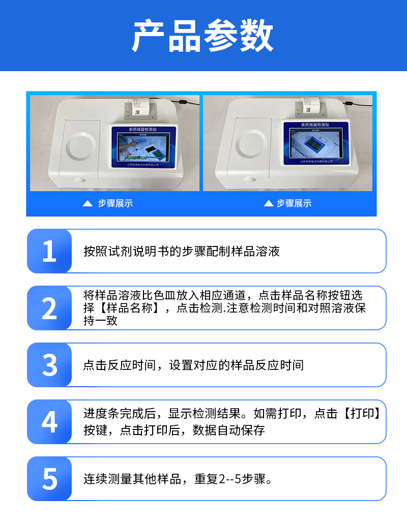 | 乙酰膽堿酯酶和丁酰膽堿酯酶試劑均可以使用,符合國家標(biāo)準(zhǔn)和農(nóng)業(yè)部標(biāo)準(zhǔn)的要求。 | 自動判斷樣品是否合格,檢測結(jié)果更加直觀。 | 儀器具有100多種蔬菜名稱菜單庫,分類管理,并可按需添加或刪除蔬菜名,編輯蔬菜名稱,可直接打印出蔬菜名稱。 | 檢測通道:10個檢測通道,可以同時測試多個樣品,循環(huán)檢測,即放即檢,每個樣品由程序控制分別獨立工作,不會互相干擾。 | 智能操作系統(tǒng),采用更加人性化操作,主控采用多核處理器,主頻1.88Ghz,運轉(zhuǎn)速度更快速,穩(wěn)定性更強(qiáng)。 | 顯示方式:7英寸高靈敏真彩觸摸屏顯示,人性化中文操作界面,讀數(shù)直觀、簡單。 | 打印機(jī)采用串口5v打印,可選擇手動打印或者自動打印,三分鐘出打印結(jié)果,打印格式為檢測人姓名、吸光度差值、檢測時間、檢測機(jī)構(gòu)、樣品名稱及結(jié)果判定。 | 光源采用進(jìn)口超高亮發(fā)光二極管,具有低功耗、高精度、穩(wěn)定性強(qiáng)、光源可控可以關(guān)掉不使用的光源,響應(yīng)速度快等優(yōu)點。 | 智能恒流穩(wěn)壓,光強(qiáng)自動校準(zhǔn),長時間連續(xù)工作光源無溫漂現(xiàn)象。 | 儀器具有GPRS遠(yuǎn)傳功能,可插手機(jī)卡實現(xiàn)數(shù)據(jù)遠(yuǎn)傳平臺,wifi聯(lián)網(wǎng)功能,可將數(shù)據(jù)快速上傳電腦,進(jìn)行數(shù)據(jù)管理與統(tǒng)計。 | 采用USB2.0接口設(shè)計,方便數(shù)據(jù)的存貯和移動,并可隨時與計算機(jī)直接相連,并且可用計算機(jī)控制儀器。實現(xiàn)數(shù)據(jù)查詢、瀏覽、分析、統(tǒng)計、打印等。 | 智能化程度高,儀器具有自檢功能:具有開機(jī)自檢和調(diào)零功能,具有自動檢測重復(fù)性功能 | 儀器具有自身保護(hù)功能,可設(shè)置用戶名及密碼,防止非工作人員操作等。 | 采用DC12v直流供電,安全系統(tǒng)更高,并且配備6A鋰電池充電器。 | 儀器具有重新校準(zhǔn)、鎖定、恢復(fù)出廠設(shè)置功能。 |