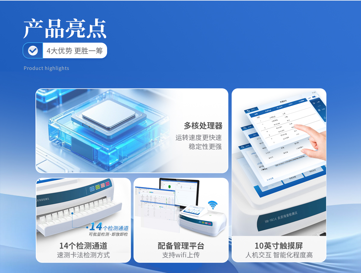 1、★采用速測(cè)卡法,省卻冗雜的步驟,提高檢測(cè)體驗(yàn)和效率 2、安卓智能系統(tǒng)7.1版本,操作更加流暢,使用更方便。 3、★10英寸高靈敏真彩觸摸屏顯示,交互性用戶體驗(yàn)更好。 4、★具有14個(gè)檢測(cè)卡通道,可更多的批量測(cè)試樣品,即放即檢,檢測(cè)效率更高。 5、支持wifi、藍(lán)牙傳輸,數(shù)據(jù)可無線上傳;支持U盤拷貝數(shù)據(jù),免驅(qū)動(dòng)插拔。 6、配置食品安全管理平臺(tái),檢測(cè)結(jié)果可長(zhǎng)期存儲(chǔ),進(jìn)行長(zhǎng)短期查看分析,輔助管理。 7、儀器具有分類管理蔬菜名稱菜單庫(kù),并可按需編輯蔬菜名稱、檢測(cè)單位等信息。 8、內(nèi)置熱敏打印機(jī),可選擇性打印詳細(xì)的檢測(cè)信息。 9、★檢測(cè)過程中檢測(cè)倉(cāng)自動(dòng)彈出,自動(dòng)關(guān)閉。 10、主控采用多核處理器,主頻1.88Ghz,運(yùn)轉(zhuǎn)速度更快速,穩(wěn)定性更強(qiáng)。