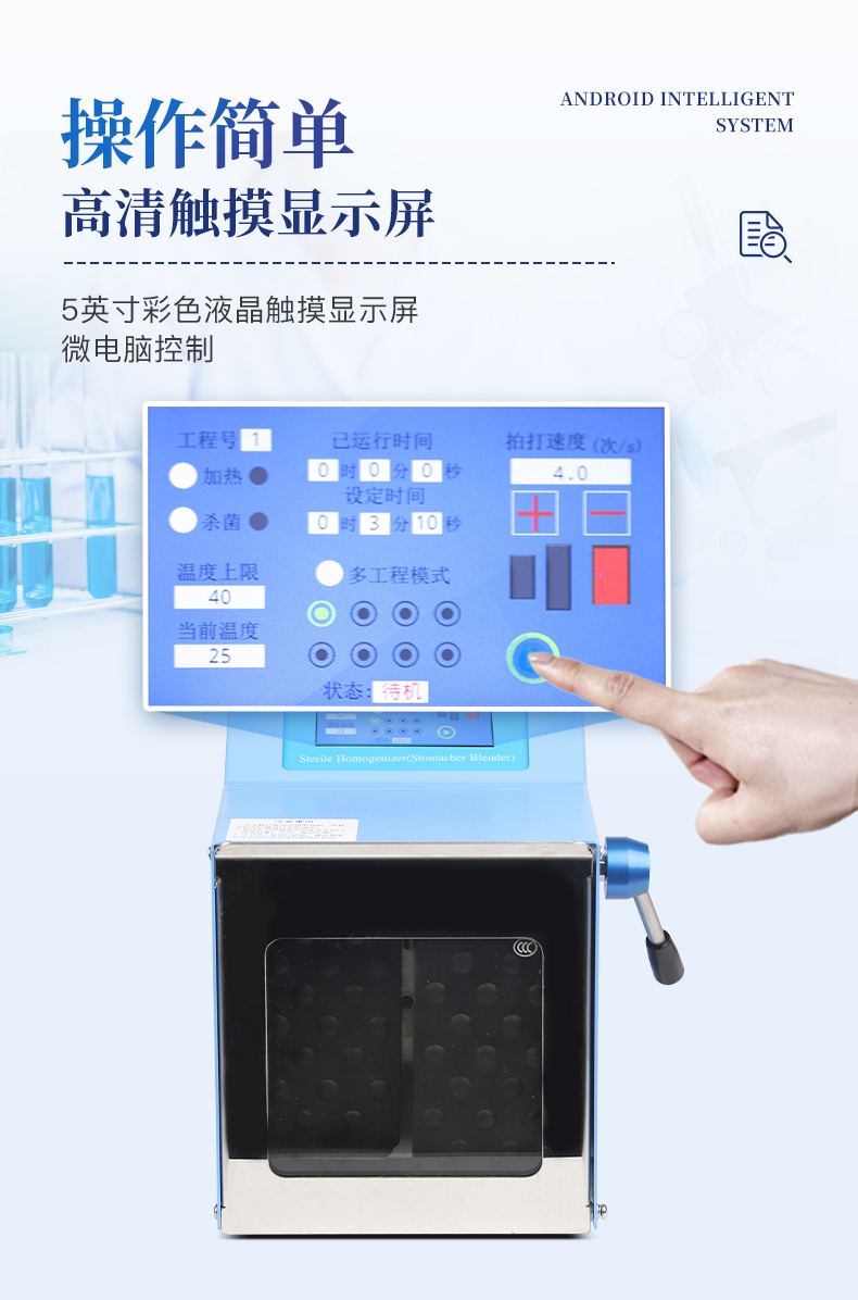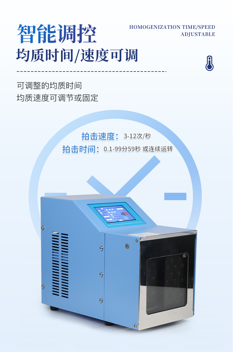 ●5英寸液晶顯示屏。 ●可儲存三組工作程序。 ●可調(diào)整的均質(zhì)時間。 ●均質(zhì)速度可調(diào)節(jié)或固定。 ●拍擊器可調(diào)整前后距離。 ●無菌一次性濾袋,保證衛(wèi)生。 ●全開啟式門,易于清洗。 ●玻璃透明窗口易于觀察 。 ●樣品與均質(zhì)儀無接觸,如無樣品泄露則不需進行系統(tǒng)清洗. ●均質(zhì)柔和、樣品零污染、無損傷、不升溫、不需要滅菌處理,不需洗刷器皿。