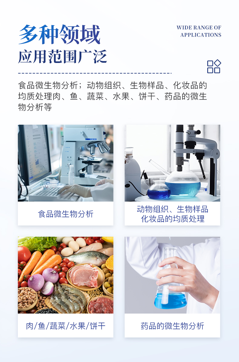 應(yīng)用領(lǐng)域:食品微生物分析;動(dòng)物組織、生物樣品、化妝品的均質(zhì)處理;肉、魚(yú)、蔬菜、水果、餅干;藥品的微生物分析等;