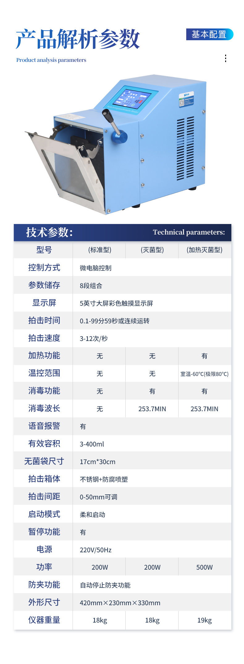 ●5英寸液晶顯示屏。 ●可儲(chǔ)存三組工作程序。 ●可調(diào)整的均質(zhì)時(shí)間。 ●均質(zhì)速度可調(diào)節(jié)或固定。 ●拍擊器可調(diào)整前后距離。 ●無(wú)菌一次性濾袋,保證衛(wèi)生。 ●全開(kāi)啟式門,易于清洗。 ●玻璃透明窗口易于觀察 。 ●樣品與均質(zhì)儀無(wú)接觸,如無(wú)樣品泄露則不需進(jìn)行系統(tǒng)清洗. ●均質(zhì)柔和、樣品零污染、無(wú)損傷、不升溫、不需要滅菌處理,不需洗刷器皿。