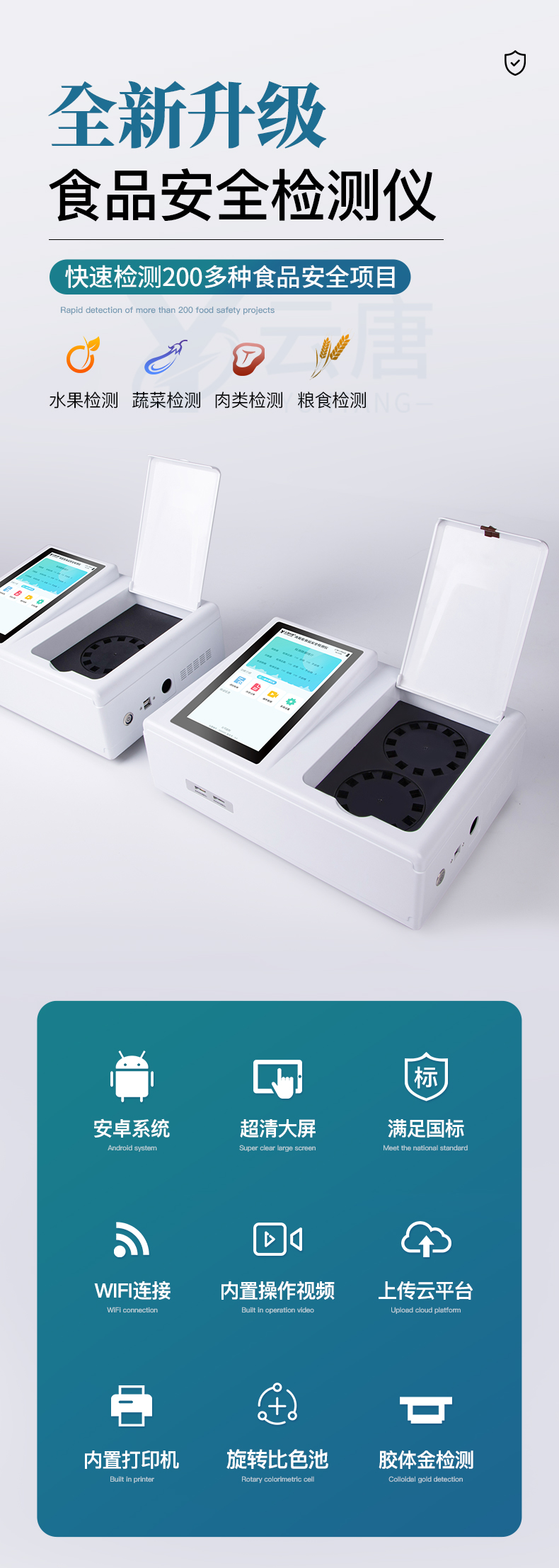 1、儀器采用臺(tái)式一體化系統(tǒng)檢測(cè)技術(shù),將分光光度模塊、數(shù)字化管理模塊、無(wú)線通訊模塊高度集成于一體,支持檢測(cè)200種食品安全檢測(cè)項(xiàng)目,同時(shí)預(yù)留升級(jí)檢測(cè)方法。
