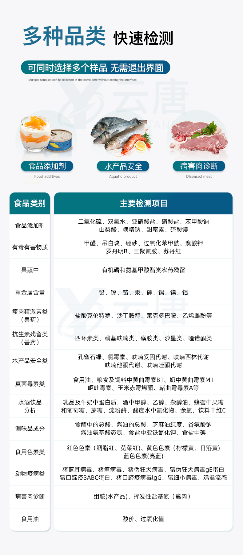 抗生素殘留(獸藥) | 四環(huán)素類、硝基呋喃類、磺胺類、β-興奮劑類、沙星類、磺胺類、喹諾酮類,甲砜霉素,氟苯尼考,金剛烷胺、替米考星、慶大霉素、林可霉素、鏈霉素、恩諾沙星、環(huán)丙沙星、頭孢啦啶、青霉素、阿莫西林等 |