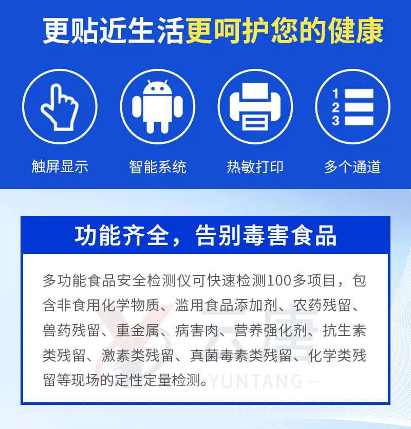 多功能食品安全檢測(cè)儀可快速檢測(cè)60多項(xiàng)目,包含非食用化學(xué)物質(zhì)、濫用食品添加劑、農(nóng)藥殘留、獸藥殘留、重金屬、病害肉、營(yíng)養(yǎng)強(qiáng)化劑、抗生素類殘留、激素類殘留、真菌毒素類殘留、化學(xué)類殘留等現(xiàn)場(chǎng)的定性定量檢測(cè)。