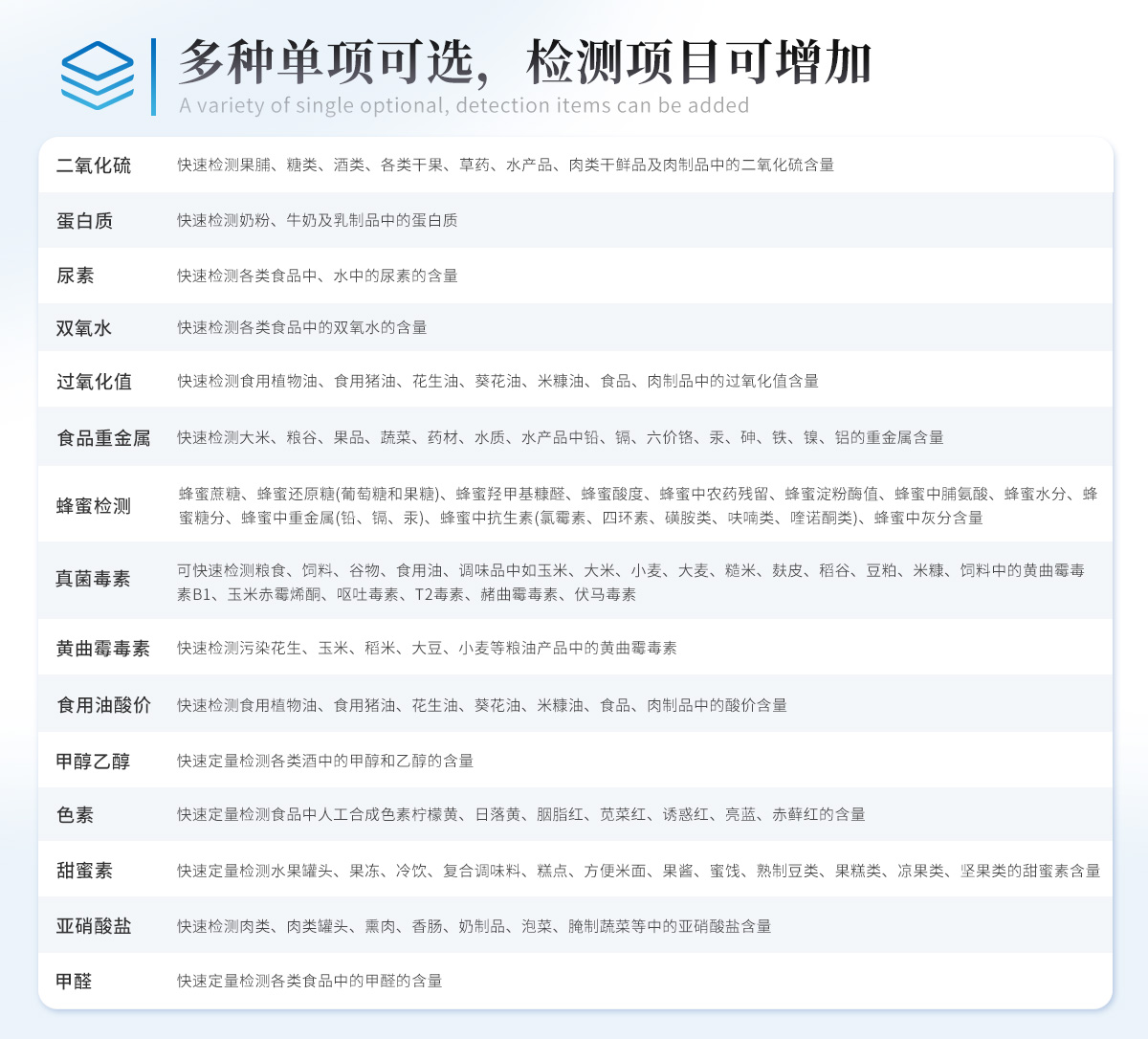 廣泛應(yīng)用于食品深加工企業(yè)、食藥監(jiān)局、商場超市、質(zhì)量監(jiān)督檢驗、工商管理、餐飲檢測、各大食品安全監(jiān)測系統(tǒng)等單位使用。