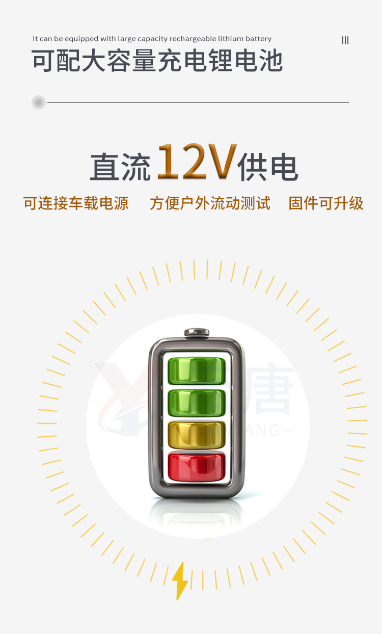 2、直流12V供電,可連接車載電源,可配6ah大容量充電鋰電池,方便戶外流動(dòng)測(cè)試。
