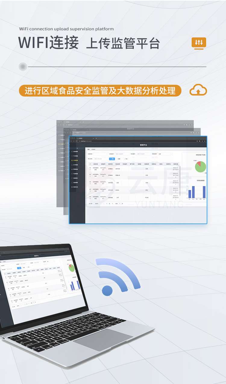 8、儀器帶有監(jiān)管平臺(tái)。數(shù)據(jù)可局域網(wǎng)和互聯(lián)網(wǎng)數(shù)據(jù)上傳,檢測(cè)結(jié)果直接傳至食品安全監(jiān)管平臺(tái)。進(jìn)行區(qū)域食品安全監(jiān)管及大數(shù)據(jù)分析處理,檢測(cè)區(qū)域食品安全長(zhǎng)短期動(dòng)態(tài),達(dá)到食品安全問題預(yù)估、預(yù)警。
