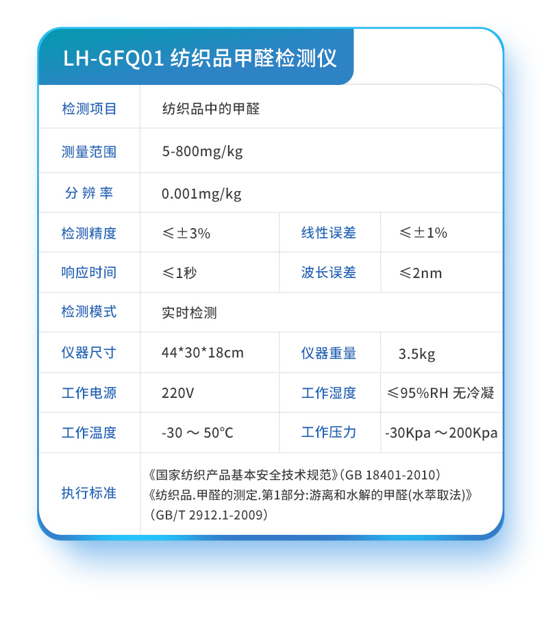 該紡織品甲醛檢測設備滿足紡織品甲醛含量檢測的中國標準《國家紡織產(chǎn)品基本安全技術(shù)規(guī)范》(GB 18401-2010)、《紡織品.甲醛的測定.第1部分:游離和水解的甲醛(水萃取法)》(GB/T 2912.1-2009), 適合各種紡織品、服裝等的甲醛含量檢測。