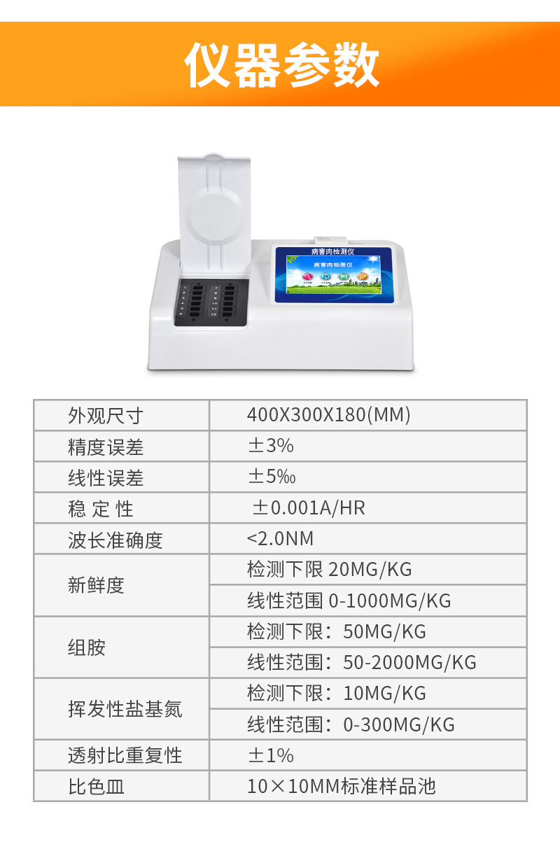 可快速檢測病害肉、組胺、揮發(fā)性鹽基氮,儀器預留其他項目檢測程序和端口,根據日后需求可方便的自主增加檢測項目。