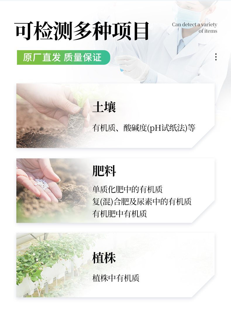 ★可檢測土壤及化肥、有機(jī)肥、植株中的有機(jī)質(zhì)含量,土壤酸堿度,含鹽量(擴(kuò)展)。